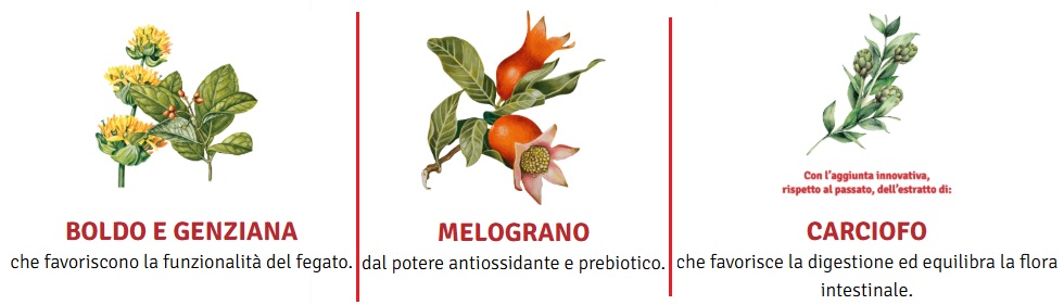 Acqua; addensante: glicerolo; aromi naturali; carciofo (Cynara cardunculus L.) foglie estratto molle, melograno (Punica granatum L.) frutto estratto secco; boldo (Peumus boldus Molina) foglie estratto molle, genziana (Genziana lutea L.) radici estratto molle; edulcorante: sucralosio.