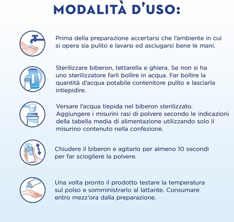 Per la salute del bambino è fondamentale seguire con precisione le norme d'igiene e le istruzioni di preparazione. Prima della preparazione, lavare e asciugare accuratamente le mani. Sterilizzare biberon, tettarella e ghiera facendoli bollire o utilizzando uno sterilizzatore. Far bollire l'acqua potabile e lasciarla raffreddare fino a circa 70 °C. Versare nel biberon la quantità d'acqua necessaria e aggiungere i misurini rasi di polvere seguendo la tabella di alimentazione indicata sulla confezione (utilizzare solo il misurino incluso). Chiudere il biberon e agitare con vigore per almeno 10 secondi per permettere la completa dissoluzione. Raffreddare il biberon sotto acqua corrente fino a raggiungere la temperatura di circa 40 °C. Verificare sempre la temperatura del latte sul polso prima della somministrazione.