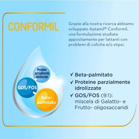 Aptamil Conformil è un alimento a fini medici speciali in polvere, appositamente formulato per la gestione dietetica di coliche e stipsi nei lattanti dalla nascita fino al sesto mese di vita. Questo prodotto nasce dalla costante ricerca scientifica nel campo della nutrizione infantile per offrire una soluzione mirata che aiuti a ridurre la frequenza e l'intensità dei fastidi intestinali. Grazie alla sua composizione studiata per favorire una digestione più facile e regolarizzare il transito intestinale, Aptamil Conformil contribuisce a ristabilire il benessere e la serenità del neonato durante i pasti e nel riposo.
