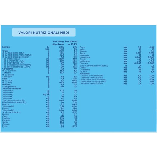 Sieroproteine idrolizzate (da latte), oli vegetali (palma, colza a basso contenuto di acido erucico, girasole, cocco), sciroppo di glucosio, galattoligosaccaridi (da latte) in polvere, maltodestrine, amido di patata, amido di mais, lattosio, frutto-oligosaccaridi, olio di pesce, idrogenofosfato di potassio, fosfato di calcio, cloruro di calcio, cloruro di colina, olio estratto da Mortierella alpina, idrogenofosfato di magnesio, cloruro di potassio, cloruro di sodio, acido L-ascorbico, inositolo, taurina, solfato ferroso, L-carnitina, solfato di zinco, uridina 5'-monofosfato sale sodico, acetato di DL-alfa-tocoferile, citidina 5'-monofosfato, calcio D-pantotenato, adenosina 5'-monofosfato, inosina 5'-monofosfato sale sodico, nicotinamide, guanosina 5'-monofosfato sale sodico, solfato rameico, riboflavina; emulsionante: lecitina di soia; palmitato di retinile, cloridrato di tiamina, cloridrato di piridossina, ioduro di potassio, acido folico, solfato di manganese, selenito di sodio, fitomenadione, colecalciferolo, D-biotina, cianocobalamina.