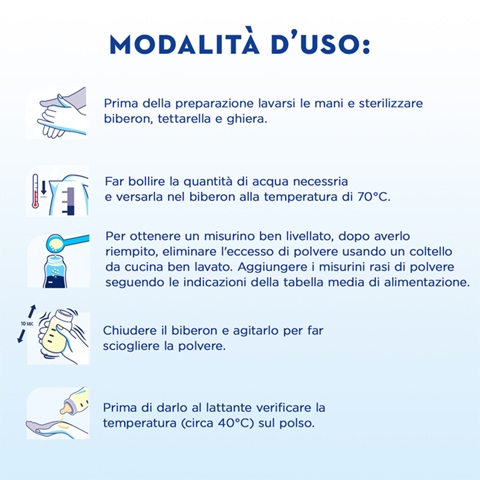 Il latte materno è l'alimento ideale per il lattante ed è raccomandato come alimento esclusivo fino al 6 mese e come componente lattea di una dieta equilibrata durante lo svezzamento e anche dopo l'anno di vita. Quando manca, è consigliabile utilizzare un latte per lattanti esclusivamente dietro il consiglio del Pediatra. Si raccomanda di preparare il prodotto solo al momento del pasto e di consumarlo entro 30 minuti. Non riscaldare né bollire il latte una volta pronto e non riutilizzare l'eventuale prodotto avanzato. Conservare la confezione in un luogo asciutto e lontano da fonti di calore. Dopo l'apertura, richiudere bene e consumare il contenuto entro un mese.