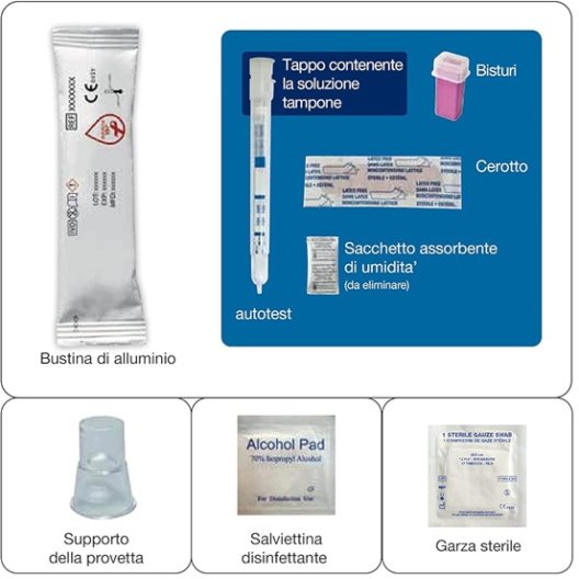 1 bustina di alluminio con: 1 autotest, 1 tappo con soluzione tampone, 1 bisturi di sicurezza, 1 cerotto.