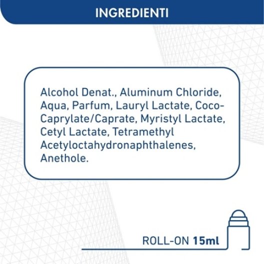 Cloruro di Alluminio: Presente in una concentrazione ottimale per ridurre significativamente il flusso sudorale, mantenendo l'area ascellare asciutta anche nelle condizioni più critiche.