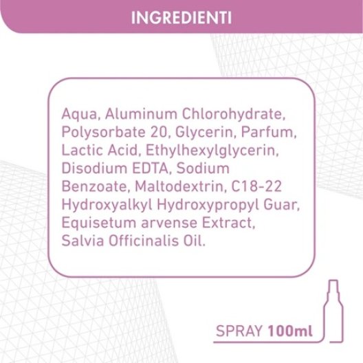 Aqua, aluminum chlorohydrate, polysorbate 20, glycerin, parfum, lactic acid, ethylhexylglycerin, disodium EDTA, sodium benzoate, maltodextrin, C18-22 hydroxyalkyl hydroxypropyl guar, Equisetum arvense extract, Salvia officinalis oil.