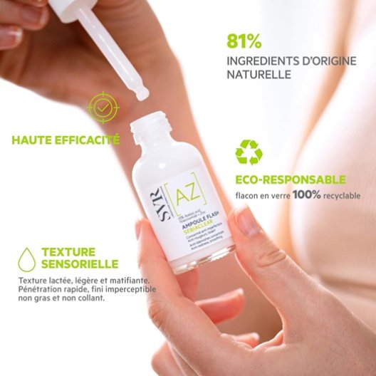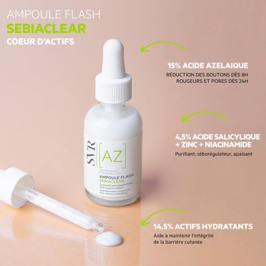 SVR Sebiaclear Ampoule Flash è un concentrato bifasico innovativo studiato per offrire un'azione "urto" contro imperfezioni e infiammazioni. Grazie a un'altissima concentrazione di acido azelaico, questo siero calma la pelle istantaneamente e riduce visibilmente le imperfezioni in sole 8 ore, rendendo l'incarnato più liscio e omogeneo.
