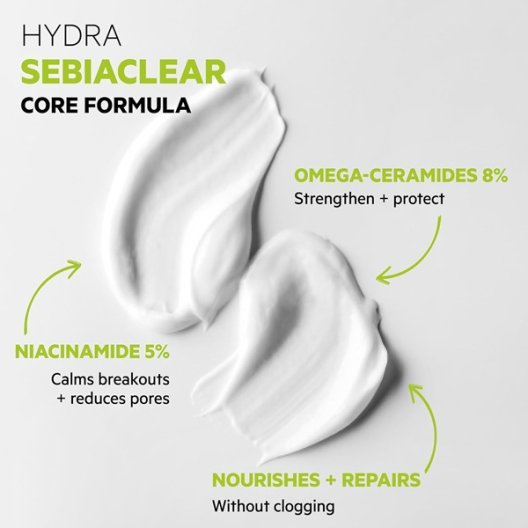 Sebiaclear Hydra offre un comfort a lunga durata, ideale per chi avverte la pelle "che tira" o nota zone di desquamazione. Nonostante l'alto potere nutriente, la formula è studiata per non ostruire i pori e per lasciare il viso morbido e lenito, senza residui untuosi.