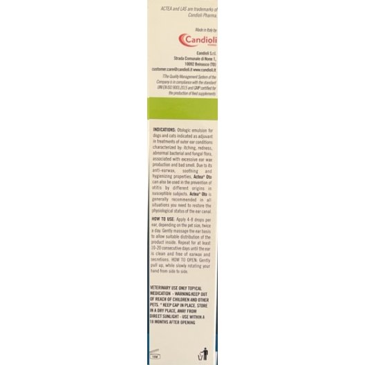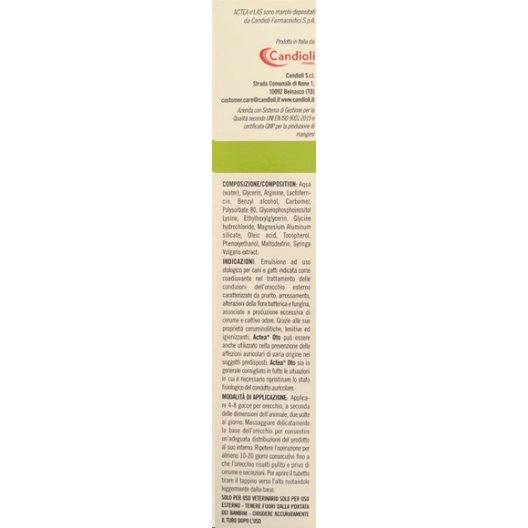 Actea Oto gocce otologiche è un'innovativa emulsione ad uso otologico progettata per coadiuvare nel trattamento delle condizioni dell'orecchio esterno nei tuoi amici a quattro zampe. Questa emulsione è indicata per situazioni caratterizzate da prurito, arrossamento, alterazioni della flora batterica e fungina, produzione eccessiva di cerume e cattivo odore. Grazie alle sue proprietà ceruminolitiche, lenitive ed igienizzanti, Actea Oto può essere utilizzato anche per la prevenzione di affezioni auricolari di varia origine nei soggetti predisposti.