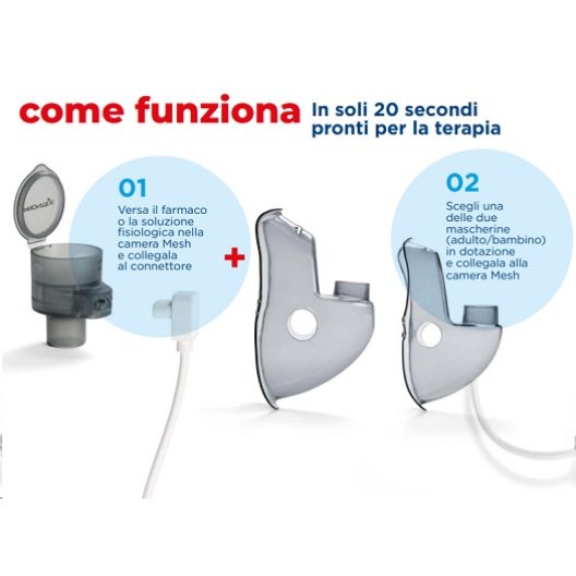 Tecnologia Mesh di ultima generazione: Grandezza particelle: MMAD 1,51μm Dimensione media tale da poter penetrare più in profondità nell’area interessata. Neb Rate: 0.30ml/min