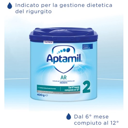 Aptamil AR 2 è un alimento a fini medici speciali in polvere, formulato specificamente per la gestione dietetica del rigurgito nei lattanti dal 6° al 12° mese compiuto. Questa formula di proseguimento è stata sviluppata per rispondere alle esigenze nutrizionali dei bambini che presentano episodi frequenti di risalita del latte, integrandosi in un regime alimentare che, dopo il sesto mese, inizia a diventare diversificato. La sua formula bilanciata combina l'esperienza scientifica di Aptamil con ingredienti funzionali mirati a ridurre meccanicamente il reflusso.