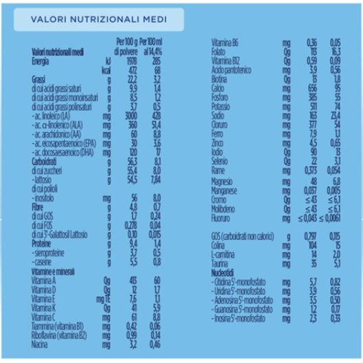 Lattosio, oli vegetali (palma, cocco, colza a basso contenuto di acido erucico, girasole), latte scremato in polvere, siero di latte demineralizzato (in polvere), galatto-oligosaccaridi da latte (in polvere); addensante: farina di semi di carrube; concentrato di sieroproteine da latte, fosfato di calcio, olio di pesce, sieroproteine da latte (in polvere), frutto-oligosaccaridi, citrato di sodio, cloruro di magnesio, carbonato di calcio, citrato di potassio, cloruro di potassio, cloruro di colina, olio estratto da Mortierella alpina, acido L-ascorbico; emulsionante: lecitina di soia; inositolo, taurina, solfato ferroso, L-triptofano, solfato di zinco, sodio L-ascorbato, L-carnitina, citidina 5'-monofosfato, acetato di DL-alfa-tocoferile, uridina 5'-monofosfato sale sodico; antiossidante: ascorbil palmitato; calcio D-pantotenato, adenosina 5'-monofosfato, inosina 5'-monofosfato sale sodico, nicotinamide, guanosina 5'-monofosfato sale sodico, solfato rameico, DL-alfa-tocoferolo, palmitato di retinile, cloridrato di tiamina, cloridrato di piridossina, riboflavina, acido folico, ioduro di potassio, solfato di manganese, selenito di sodio, fitomenadione, D-biotina, colecalciferolo, cianocobalamina.