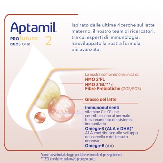 La formula si distingue per l'esclusiva combinazione Duobiotik, che integra gli oligosaccaridi HMO 2'FL e HMO 3'GL (quest'ultimo derivante dal processo produttivo esclusivo di Aptamil). La presenza di fibre prebiotiche GOS/FOS e di grasso del latte garantisce un profilo lipidico di alta qualità. Per supportare le difese naturali, la formula è arricchita con immunonutrienti come le vitamine C e D, che contribuiscono al normale funzionamento del sistema immunitario. Inoltre, l'apporto di Omega-3 (ALA e DHA) e Omega-6 è fondamentale per lo sviluppo del cervello, del sistema nervoso e della funzione visiva in questa fase di rapido accrescimento.