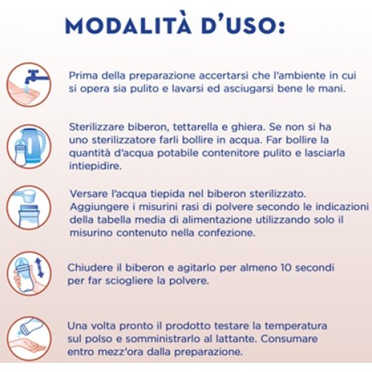 Il latte materno è l'alimento ideale per il lattante. Quando manca, è consigliabile utilizzare un latte di proseguimento esclusivamente dietro consiglio del Pediatra. Si raccomanda di preparare il latte solo al momento del pasto e di consumarlo entro 30 minuti. Non riscaldare o bollire il prodotto una volta pronto e non riutilizzare mai l'eventuale latte avanzato. La confezione integra va conservata in luogo fresco, asciutto e lontano da fonti di calore. Una volta aperta, richiudere correttamente e consumare il prodotto entro un mese. La conservazione inadeguata o una preparazione non conforme possono comportare rischi per la salute del bambino.