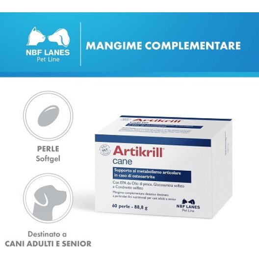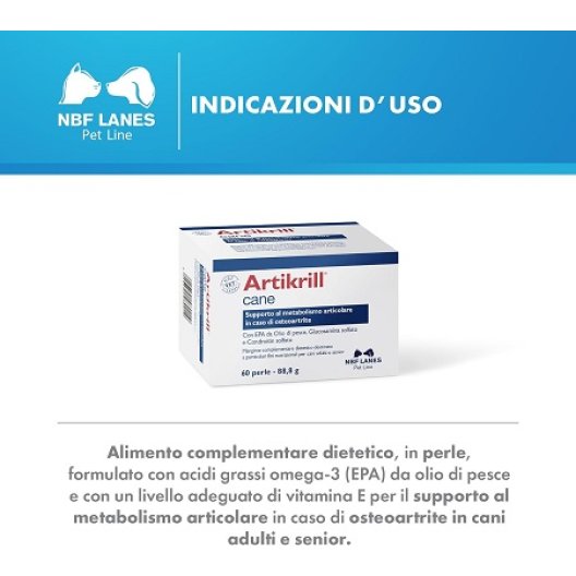 Il benessere articolare è fondamentale per la qualità della vita del tuo cane, soprattutto con l'avanzare dell'età o in presenza di patologie come l'osteoartrite, che possono causare rigidità e dolore. Artikrill Cane 60 Perle di NBF Lanes è il mangime complementare dietetico in perle softgel, studiato per supportare attivamente il metabolismo articolare del tuo fedele amico.