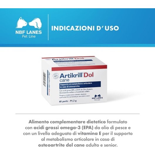 Il tuo cane mostra segni di disagio articolare, rigidità o soffre di osteoartrite? Artikrill Dol Cane 60 Perle di NBF Lanes è il mangime complementare dietetico specificamente formulato per fornire un supporto nutrizionale avanzato e mirato alle articolazioni dei cani adulti e anziani. Questo formato intermedio garantisce un trattamento efficace e continuativo.