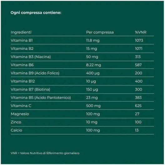 Riduce la sensazione di stanchezza e affaticamento grazie alla presenza di vitamine B2, B6, B12, acido pantotenico, acido folico, nicotinamide, vitamina C e magnesio.