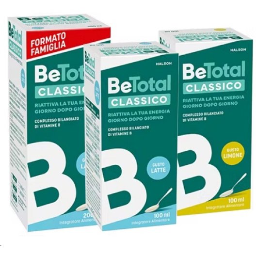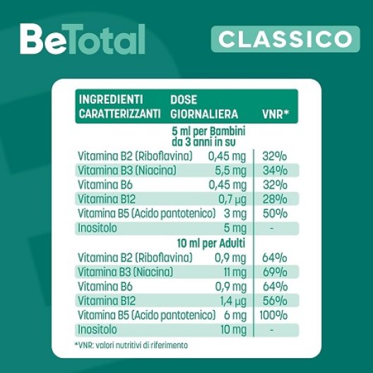 Il BeTotal Classico Sciroppo è la soluzione perfetta per riattivare la tua energia giorno dopo giorno. Contiene un complesso bilanciato di Vitamine B in forma liquida, pensato per supportare il normale metabolismo energetico e contribuire al tuo benessere complessivo.