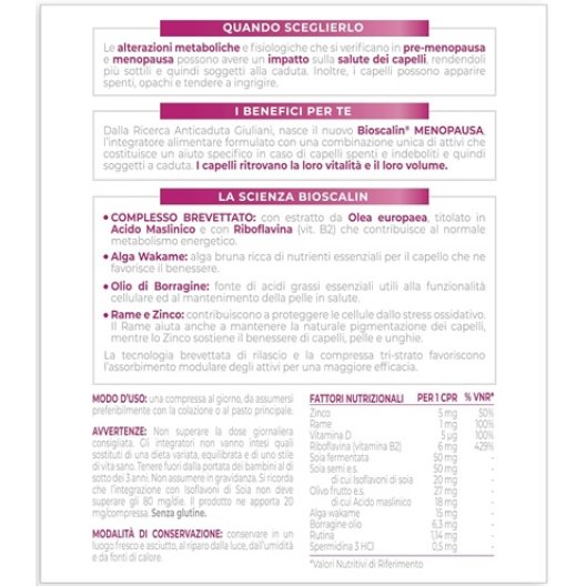 Bioscalin Menopausa è il nuovo integratore alimentare specificamente formulato per supportare la salute dei capelli durante i delicati periodi di pre-menopausa e menopausa. In questa fase della vita, le alterazioni metaboliche e fisiologiche possono indebolire i capelli, rendendoli più sottili, spenti e soggetti alla caduta. Grazie a una combinazione unica di attivi e alla sua tecnologia brevettata di rilascio, Bioscalin Menopausa offre un aiuto specifico per contrastare il diradamento, favorendo una chioma visibilmente più voluminosa, corposa e luminosa. La sua efficacia è clinicamente testata.