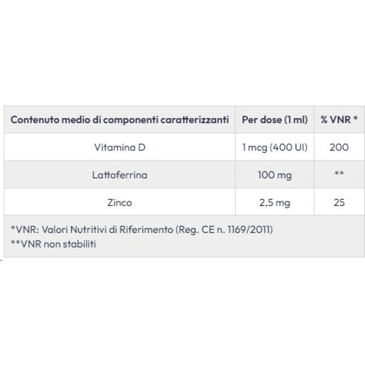 Fruttosio, Acqua, Lattoferrina, Gluconato di zinco, Aromi, Vitamina D (Colecalciferolo); Acidificante: Acido citrico ( E330).