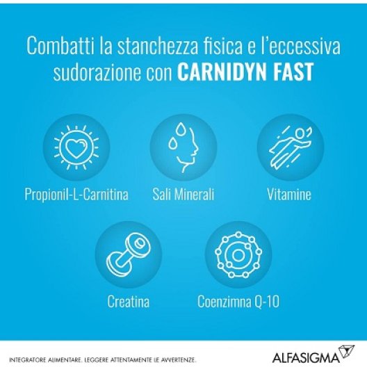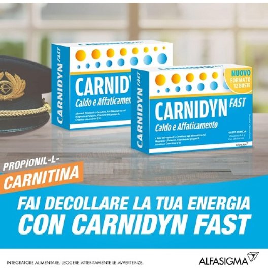 Carnidyn Fast è un integratore alimentare formulato per affrontare situazioni di ridotto apporto di propionil-L-carnitina e altri nutrienti essenziali, o in casi di aumentato fabbisogno dovuto a caldo e affaticamento.