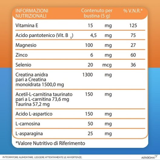 Acidificante: acido citrico anidro; creatina anidra, magnesio idrossido; regolatore di acidità: potassio carbonato; acetil-L-carnitina taurinato cloridrato, acido L-aspartico; colorante: rosso barbabietola; regolatore di acidità: sodio carbonato anidro; aroma: arancia; L-carnosina, D,L-alfa-tocoferil acetato (vitamina E) al 50%; edulcorante: aspartame; L-asparagina monoidrato, zinco lattato triidrato; edulcorante: acesulfame K; lievito arricchito in selenio allo 0,2%; calcio D-pantotenato (vitamina B5); colorante: riboflavina 5'-fosfato sale sodico.