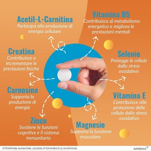 - Creatina: Incrementa le prestazioni fisiche durante attività ripetitive, di elevata intensità e di breve durata (dosaggio di 3g/die).