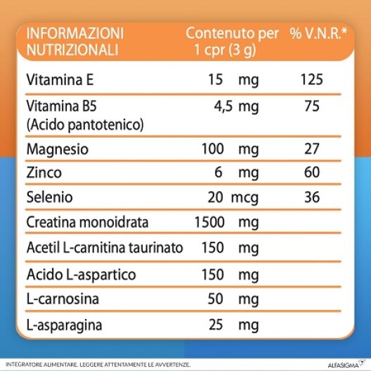 Creatina monoidrata; edulcoranti: sorbitolo, xilitolo, acesulfame K, sucralosio; magnesio ossido, acetil-L-carnitina taurinato cloridrato, acido-L-aspartico, aroma agrumi; antiagglomeranti: sali di acidi grassi di magnesio, biossido di silice, DL-alfa-tocoferil acetato (vitamina E), L-carnosina, zinco gluconato; agente di carica: idrossipropilmetilcellulosa; L-asparagina monoidrato; acidificante: acido citrico; lievito al selenio, calcio D-pantotenato (vitamina B5).