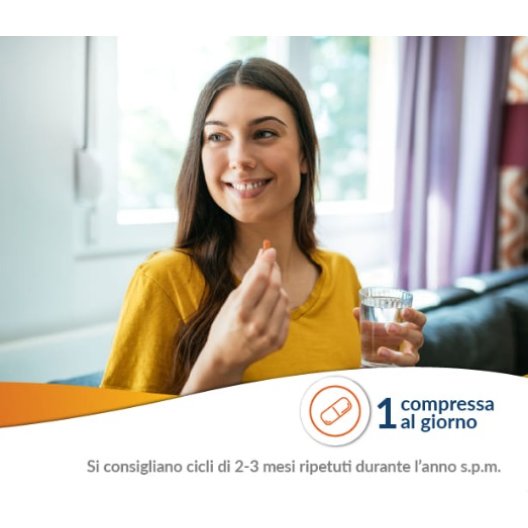 1 compressa al giorno, da deglutire con acqua.