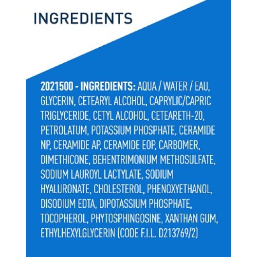 Aqua / Water, Glycerin, Cetearyl Alcohol, Caprylic/Capric Triglyceride, Cetyl Alcohol, Ceteareth-20, Petrolatum, Dimethicone, Phenoxyethanol, Behentrimonium Methosulfate, Potassium Phosphate, Ethylhexylglycerin, Sodium Lauroyl Lactylate, Disodium Edta, Dipotassium Phosphate, Ceramide Np, Ceramide Ap, Phytosphingosine, Cholesterol, Xanthan Gum, Carbomer, Sodium Hyaluronate, Tocopherol, Ceramide Eop.