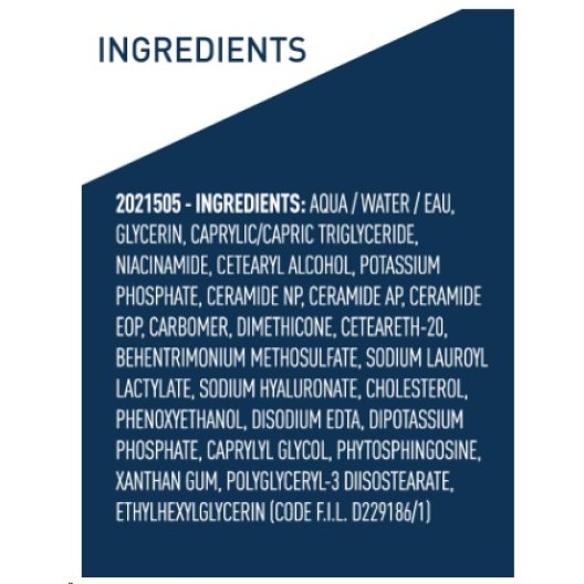 Aqua/water, Glycerin, Caprylic/capric triglyceride, Niacinamide, Cetearyl alcohol, Dimethicone, Phenoxyethanol, Ceteareth-20, Behentrimonium methosulfate, Caprylyl glicol, Polyglyceryl-3 diisostearate, Sodium lauroyl lactylate, Potassium phosphate, Disodium EDTA, Dipotassium phosphate, Ceramide NP, Ceramide AP, Ceramide EOP, Phytosphingosine, Cholesterol, Xanthan gum, Carbomer, Ethylhexylglycerin, Sodium hyaluronate.