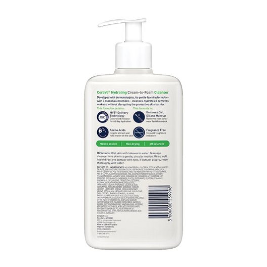 Il Detergente Crema-Schiuma Idratante di Cerave è un detergente viso appositamente formulato per pelli da normali a secche. Questa innovativa crema-schiuma si trasforma in una leggera schiuma al contatto con l'acqua, rimuovendo efficacemente impurità, sebo e trucco senza compromettere l'idratazione naturale della pelle. Arricchita con tre ceramidi essenziali, amminoacidi e acido ialuronico, questa formula delicata rinforza la barriera cutanea e trattiene l'idratazione, lasciando la pelle morbida e idratata.