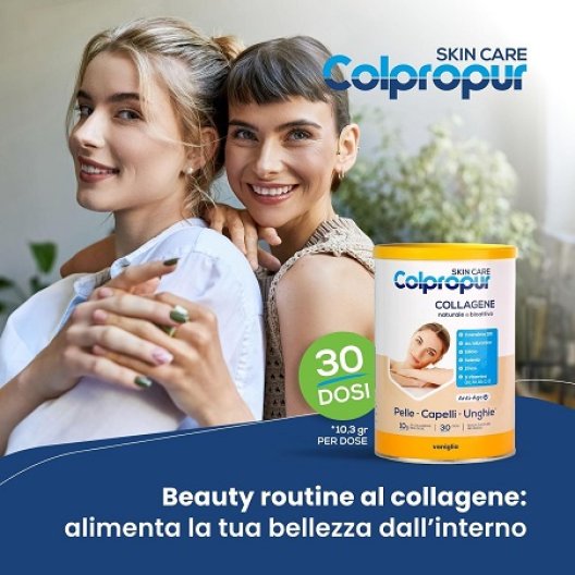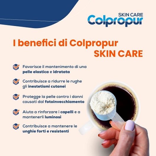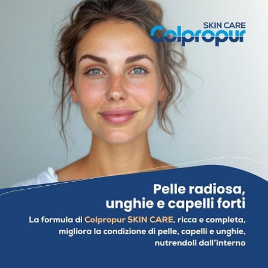 Colpropur Skin Care è un integratore alimentare avanzato formulato per la bellezza e il benessere di pelle, capelli e unghie, con una mirata azione anti-età. A base di collagene idrolizzato, coenzima Q10, acido ialuronico, silicio, selenio, zinco e un complesso di vitamine (B2, B3, B8, C, E), offre una soluzione completa per contrastare i segni del tempo e migliorare l'aspetto generale.