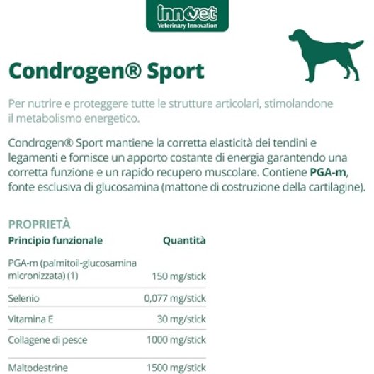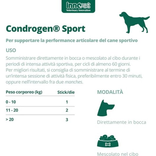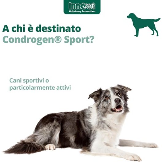 Condrogen® Sport è l'alimento complementare di eccellenza, specificamente formulato per sostenere la performance articolare dei cani atleti. Per il cane sportivo, la salute non è solo ammortizzazione cartilaginea, ma funzionalità ottimale di muscoli, tendini e legamenti. Questa formula esclusiva, in pratici stick orali, nutre e protegge l'intera struttura articolare e, grazie a un apporto energetico mirato, stimola il metabolismo energetico e garantisce un rapido recupero muscolare. È l'ideale per cani impegnati in attività ad alta intensità come Agility, Sleddog o Hoopers.