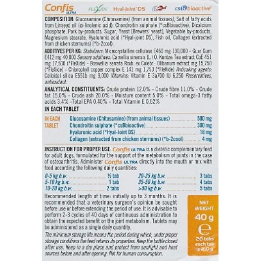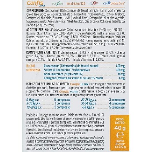 Confis Ultra 20 compresse è un mangime complementare dietetico formulato per supportare il metabolismo articolare nei casi di osteoartrite nei cani. La sua formula avanzata contiene 4 prodotti brevettati: Cs Bioactive, Hyal-Joint DS, b-2Cool e Flexide. Questi ingredienti mirano a promuovere la salute articolare, ridurre l'infiammazione e migliorare la mobilità.