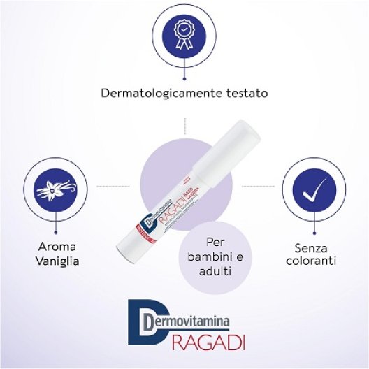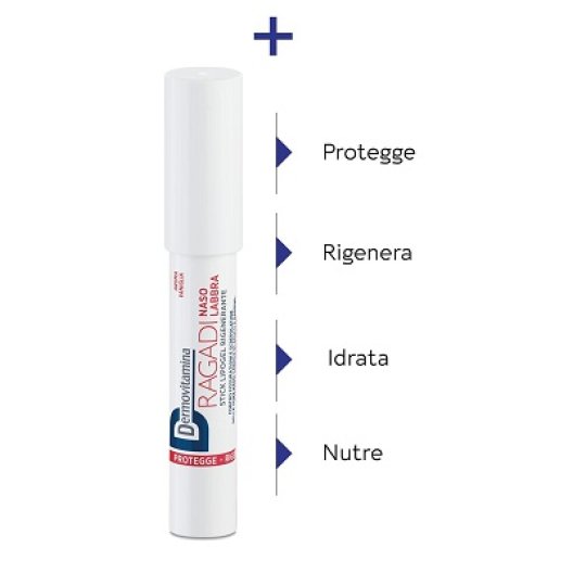 Dermovitamina Ragadi Naso Labbra Stick è un pratico gel riparatore in formato stick, appositamente formulato per trattare fissurazioni e screpolature della zona naso-labiale causate da freddo, raffreddore, vento e clima secco, sia negli adulti che nei bambini.