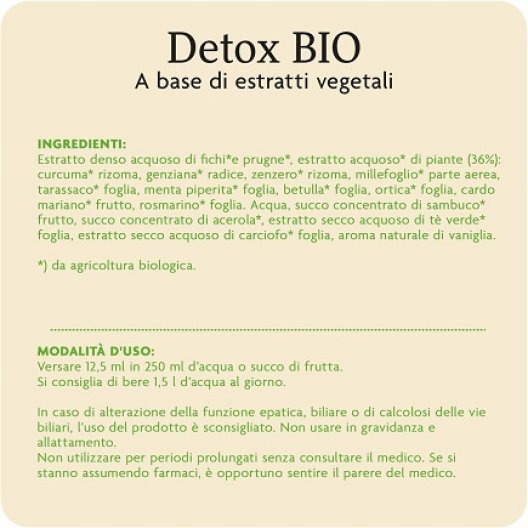 Estratto denso acquoso di fichi* (Ficus carica L.) e prugne* (Prunus domestica L.); estratto acquoso* (36%) di: curcuma* (Curcuma longa L.) rizoma, genziana* (Gentiana lutea L.) radice, zenzero* (Zingiber officinale ROSC.) rizoma, millefoglio* (Achillea millefolium L.) parte aerea, tarassaco* (Taraxacum officinale Weber) foglia, menta piperita* (Mentha x piperita L.) foglia, betulla* (Betula pendula Roth.) foglia, ortica* (Urtica dioica L.) foglia, cardo mariano* (Silybum marianum Gaertn.) frutto, rosmarino* (Rosmarinus officinalis L.) foglia; acqua, succo concentrato di sambuco* (Sambucus nigra L.) frutto, succo concentrato di acerola* (Malpighia glabra L.) fonte di vitamina C, estratto secco acquoso di tè verde* (Camellia sinensis L.) foglia, estratto secco acquoso di carciofo* (Cynara scolymus L.) foglia, aroma naturale di vaniglia.