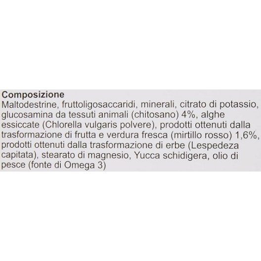 Lattosio, maltodestrine, FOS, saccarosio, cellulosa microcristallina, proteine idrolizzate, olio di pesce, chitosano, yucca schidigera, reishi, vaccinum macrocarpon (cranberry), citrato di potassio.