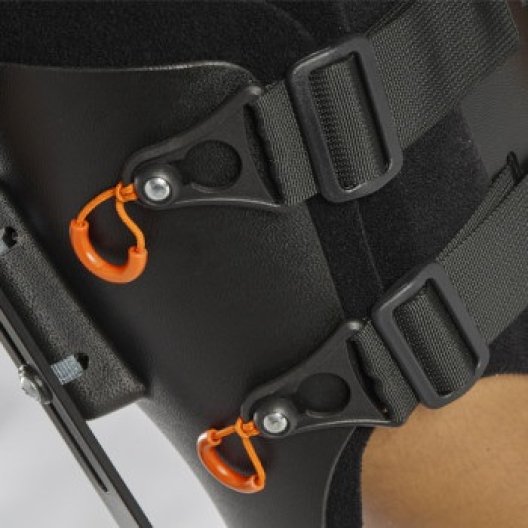 - Il tutore universale per anca con controllo di flessione-estensione e abduzione-adduzione ha uno steccaggio monocentrico con regolazione del R.O.M e della lunghezza tramite il sistema di scorrimento. Il R.O.M. è regolabile a 0° 15° 40° 60° 80° 100° sia in flessione che in estensione.