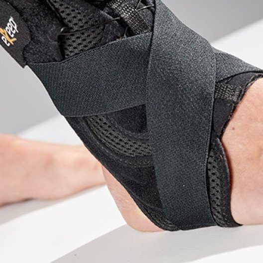 - Tendere le bende elastiche, incrociarle sul collo del piede e fissarle sul lato opposto tramite le chiusure a strappo.