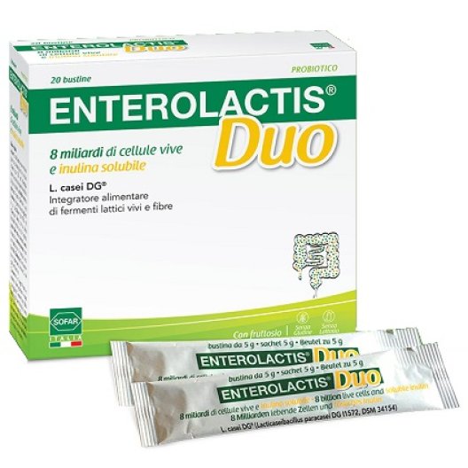 Ogni bustina di Enterolactis Duo contiene non meno di 8 miliardi di L. casei DG, contribuendo a colonizzare efficacemente il lume intestinale. L'inulina, fibra solubile aggiunta, è utile in caso di scarso apporto di fibre nella dieta. Enterolactis Duo, insieme a un adeguato consumo di liquidi, è particolarmente indicato per stimolare la motilità intestinale ed equilibrare la flora microbica alterata, promuovendo il benessere gastrointestinale.