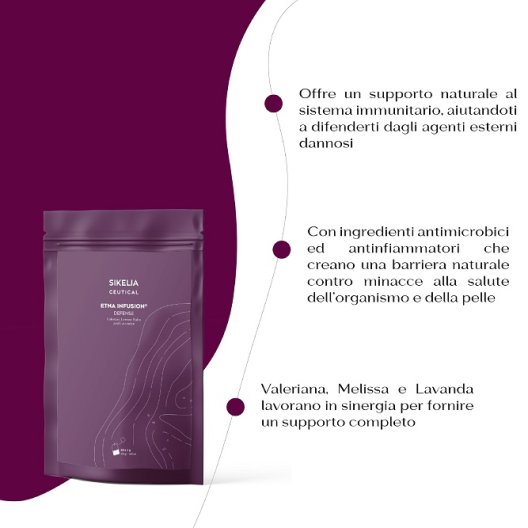 Etna Infusion Defense è una tisana formulata per proteggere e rilassare, offrendo un sostegno naturale al sistema immunitario. Grazie agli ingredienti dalle spiccate attività antimicrobiche e antinfiammatorie, questa infusione crea una barriera naturale contro gli agenti esterni che possono influire negativamente sulla salute dell’organismo e della pelle. Valeriana, Melissa e Lavanda, note per la loro azione sedativa, favoriscono il rilassamento, contribuendo a un benessere completo.