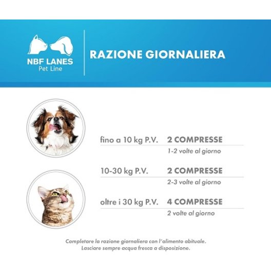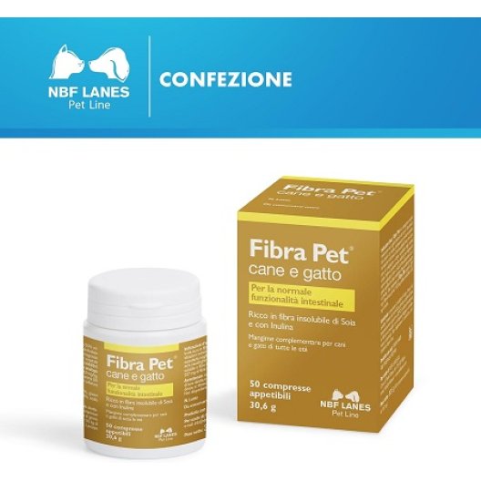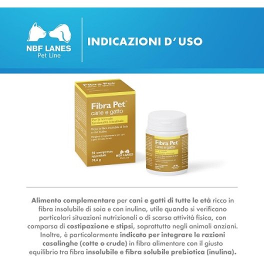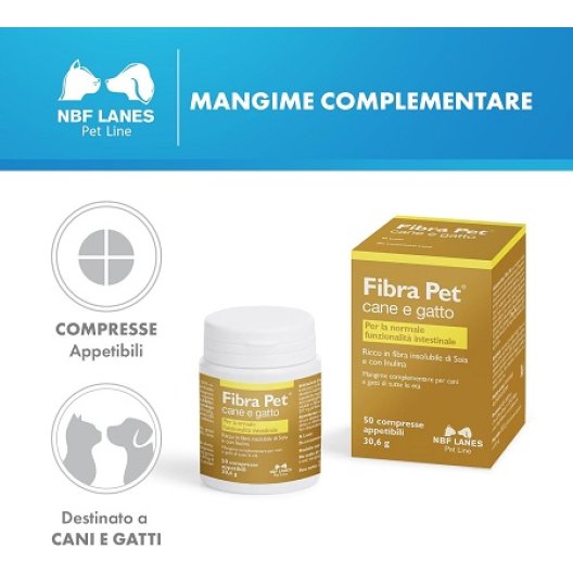 Fibra Pet 50 Compresse di NBF Lanes è il mangime complementare ideale per supportare la salute intestinale di cani e gatti di tutte le età. Questo prodotto è una soluzione efficace e naturale, particolarmente utile in situazioni nutrizionali specifiche o per animali con scarsa attività fisica. Grazie alla sua formula ricca di fibra insolubile di soia e inulina (fibra solubile prebiotica), Fibra Pet è un valido alleato per contrastare problemi comuni come costipazione e stipsi, un disturbo frequente, specialmente nei nostri amici animali più anziani. Perfetto per integrare le diete casalinghe, garantisce un equilibrio ottimale tra i diversi tipi di fibra, promuovendo un transito intestinale regolare e un microbiota sano. Ogni compressa apporta 227 mg di fibra di soia (di cui 113,5 mg di fibra insolubile) e 50 mg di inulina, per un benessere che parte dall'intestino.