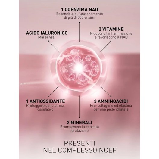 - Effetto rivitalizzante: Agisce in profondità sulla compattezza e luminosità cutanea, grazie all'efficacia del complesso NCEF.