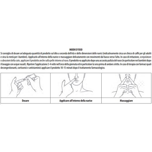 Si consiglia di dosare un'adeguata quantità di prodotto sul dito in base all'età e alle dimensioni delle narici. Applicare all'interno della narice e massaggiare delicatamente dal basso verso l'alto. In caso di irritazioni, applicare anche sulla pelle intorno al naso. Ripetere l'applicazione 3-4 volte al giorno, specialmente la sera prima di andare a letto.