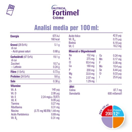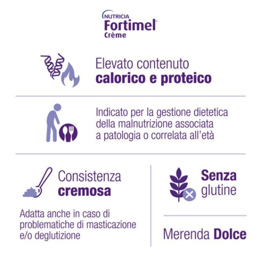 Attenzione: Fortimel Creme deve essere utilizzato esclusivamente sotto controllo medico. Non è idoneo come unica fonte di nutrimento e non deve essere somministrato per via parenterale. Il prodotto non è indicato per bambini di età inferiore ai 3 anni.