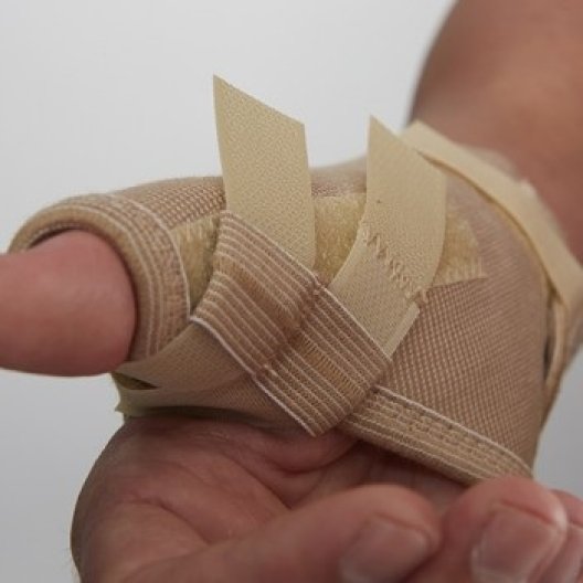 Modellazione: Appoggia lo splint ammorbidito sul pollice e massaggialo leggermente per farlo aderire alla forma della tua mano. Mantieni la posizione funzionale finché non si raffredda e torna rigido.
