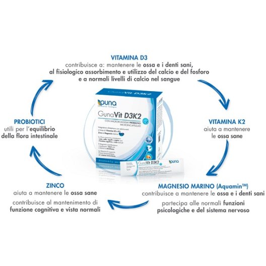 Gunavit D3K2 contiene 2 diversi microrganismi probiotici appartenenti al genere Lactobacillus utili a favorire l'equilibrio della flora intestinale. Grazie all’impiego di un processo produttivo brevettato, i 2 microrganismi probiotici contenuti in GunaVit D3K2 si presentano in forma microincapsulata e gastroprotetta. L’impiego di questa tecnologia migliora decisamente la capacità di sopravvivenza di tutti i microrganismi probiotici durante il transito gastroduodenale, consentendo in tal modo il raggiungimento dell’intestino da parte di un elevato numero di microrganismi vivi e vitali.