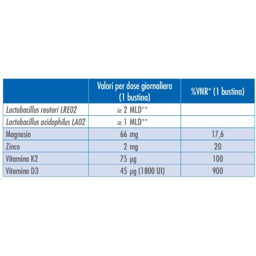 Edulcoranti: sorbitolo, xilitolo; maltodestrina, magnesio marino (idrossido di magnesio Aquamin); microrganismi probiotici microincapsulati: Lactobacillus reuteri LRE02 (DSM 23878), Lactobacillus acidophilus LA02 (DSM 21717); agenti antiagglomeranti: sali di magnesio degli acidi grassi, biossido di silicio; zinco gluconato, aroma albicocca, vitamina K2 (menachinone), vitamina D3 (colecalciferolo).
