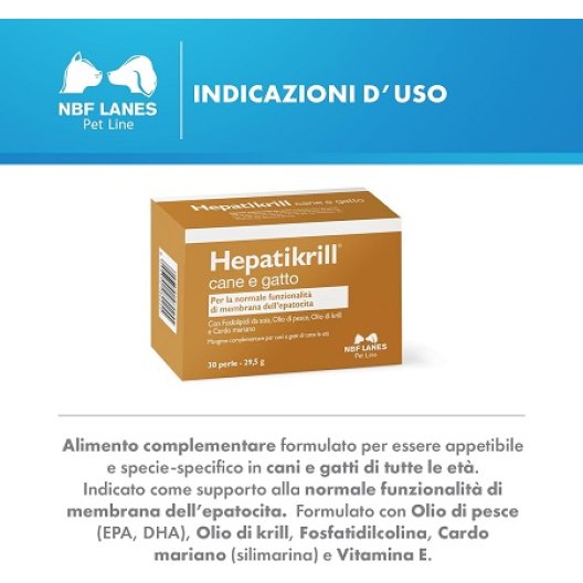 Hepatikrill 30 Perle di NBF Lanes è un mangime complementare all'avanguardia, specificamente formulato per sostenere la funzione epatica di cani e gatti, in particolare in caso di insufficienza epatica cronica. Questo potente formulato combina ingredienti chiave come gli acidi grassi Omega-3 (EPA-DHA), la fosfatidilcolina, la silimarina da Cardo Mariano e la Vitamina E. La sua azione mirata aiuta il fegato a svolgere al meglio le sue funzioni vitali di detossificazione e metabolismo. Hepatikrill può essere utilizzato sia da solo che in sinergia con diete e indicazioni specifiche del Medico Veterinario, rivelandosi un valido supporto per l'insufficienza epatica primaria o secondaria a intossicazioni. Offri al tuo pet un aiuto concreto per un fegato sano e una vita più piena.