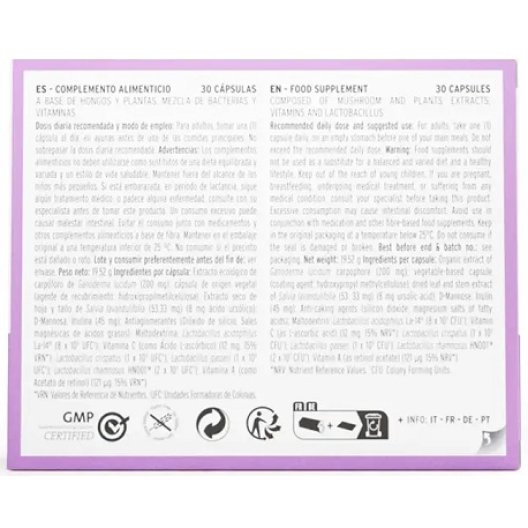 Formula naturale e innovativa con Reishi, probiotici Lactobacillus, D-Mannosio, Salvia lavandulifolia e vitamine A e C.