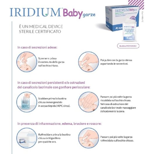 Iridium Baby Garze è il dispositivo medico essenziale per l'igiene e il trattamento perioculare di adulti e bambini. Queste 28 garze sterili monouso in puro cotone 100% sono imbevute di una soluzione lenitiva e detergente che agisce efficacemente per rimuovere croste, cispe e secrezioni causate da fenomeni infiammatori, allergici o infettivi. Grazie alla sua formulazione unica con attivi naturali come Ananas ed Echinacea e il supporto di un agente antibatterico (Clorexidina), Iridium Baby è raccomandato non solo per la pulizia quotidiana, ma anche come supporto alle terapie specifiche, prima e dopo la chirurgia oftalmica, e in caso di occlusione del canalicolo lacrimale.